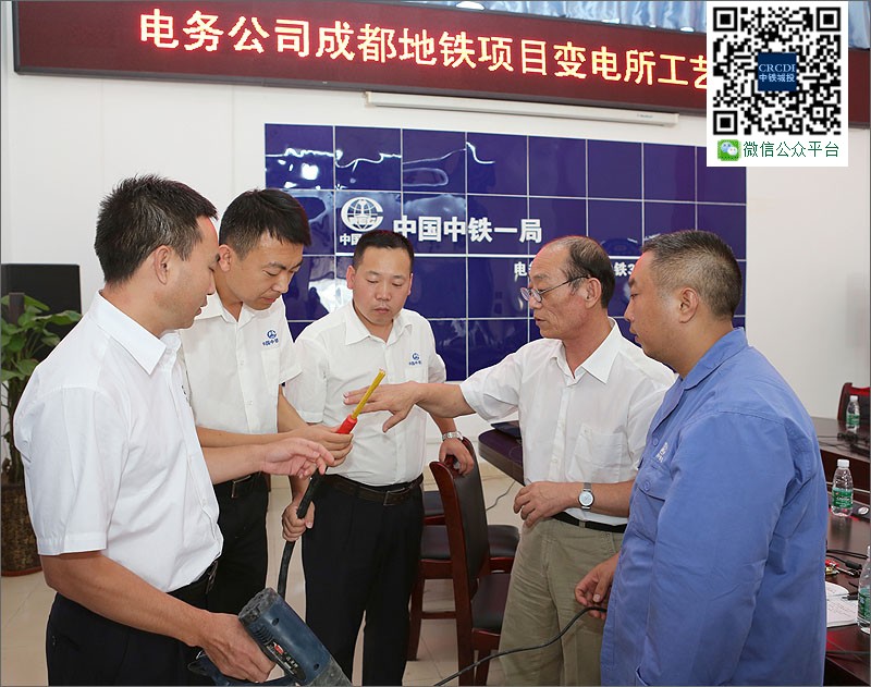 2015年7月10日、11日,在中國中鐵BT項目—成都地鐵3號線機(jī)電1標(biāo)項目部職工學(xué)校,全國知識型職工標(biāo)兵、中鐵一局電務(wù)公司電力工高級技師竇鐵成對40多名技術(shù)人員、現(xiàn)場施工人員進(jìn)行了變電所工藝工法培訓(xùn)。圖為竇鐵成(右二)與項目部技術(shù)管理人員探討電纜頭熱縮工藝。