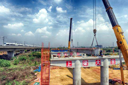 雖然現(xiàn)場(chǎng)架設(shè)只用了半個(gè)多小時(shí),但工作人員介紹,箱梁起吊、運(yùn)輸?shù)惹捌跍?zhǔn)備工作需要好幾個(gè)小時(shí)。“待兩跨之間箱梁架好后,我們將使用架橋機(jī),以加快進(jìn)度。”項(xiàng)目部技術(shù)負(fù)責(zé)人介紹,K主線1號(hào)特大橋所在的TJ2標(biāo)為全線高架“最難段”,線路全長約8039米,全程為橋梁工程,共需架設(shè)3167片箱梁,平均每天要架設(shè)9-10片,而常規(guī)的高速公路架梁一片最多6片。為確保工程建設(shè)進(jìn)度,建設(shè)投入了更多的設(shè)備。
